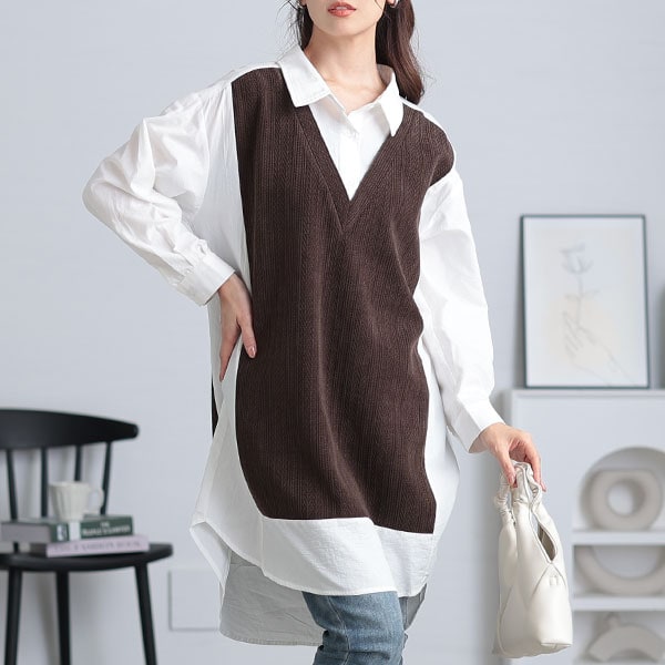 ユーモア感じる洒落感を身に纏う異素材ドッキングシャツチュニックは、ニットを重ねたようなレイヤードデザインで、こなれるシルエットな一枚。マニッシュな雰囲気に、きちんと感が加わり大人っぽさを演出します。繊細なヘリンボーン風のニット地が奥行きをつくり、ラウンドヘムで柔らかな印象に。ブロック配色で縦ラインを強調しながら、着痩せ効果を発揮し、スタイリッシュさをプラス。ゆったりなサイズ感でリラクシーな着心地に、太ももラインまでしっかり体型カバーします。