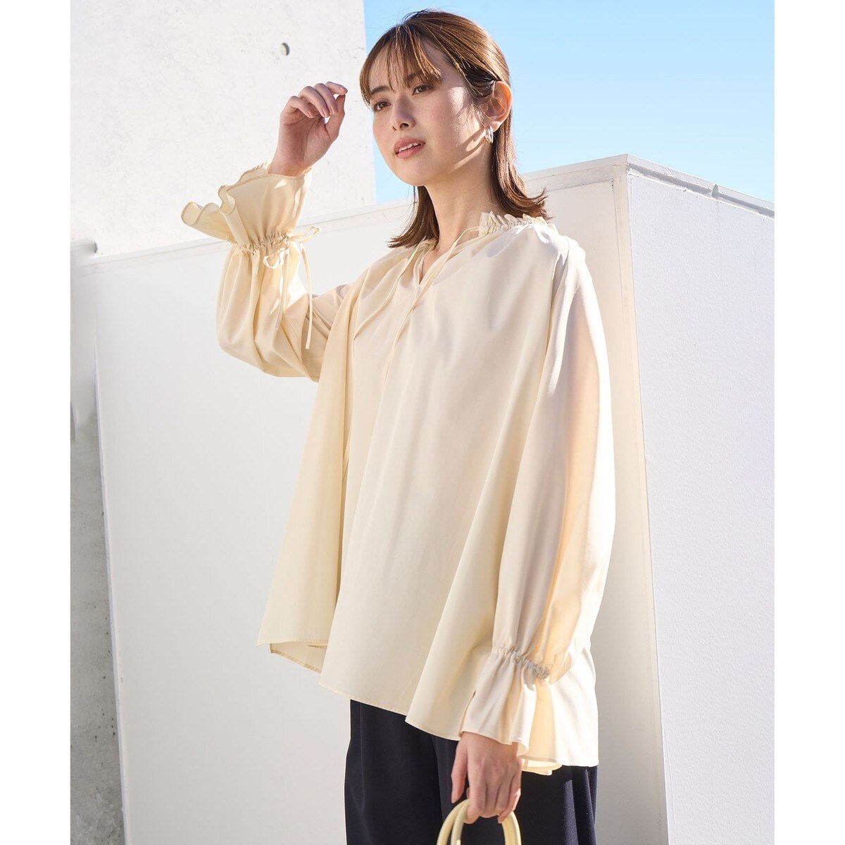 ■デザイン首元・袖口のフリルデザインと華奢なリボンがポイントのブラウス。清潔感のあるカラー展開で可愛くなり過ぎず大人な着こなしが叶います。サラッと着るだけで着映えする、ゆとりのあるサイジングも魅力。前後2WAYでご着用いただけるので、その時のムードに合わせて異なる表情をお楽しみいただけ、1枚ではもちろん、羽織アイテムやスウェットなどとレイヤードした着こなしもオススメです。