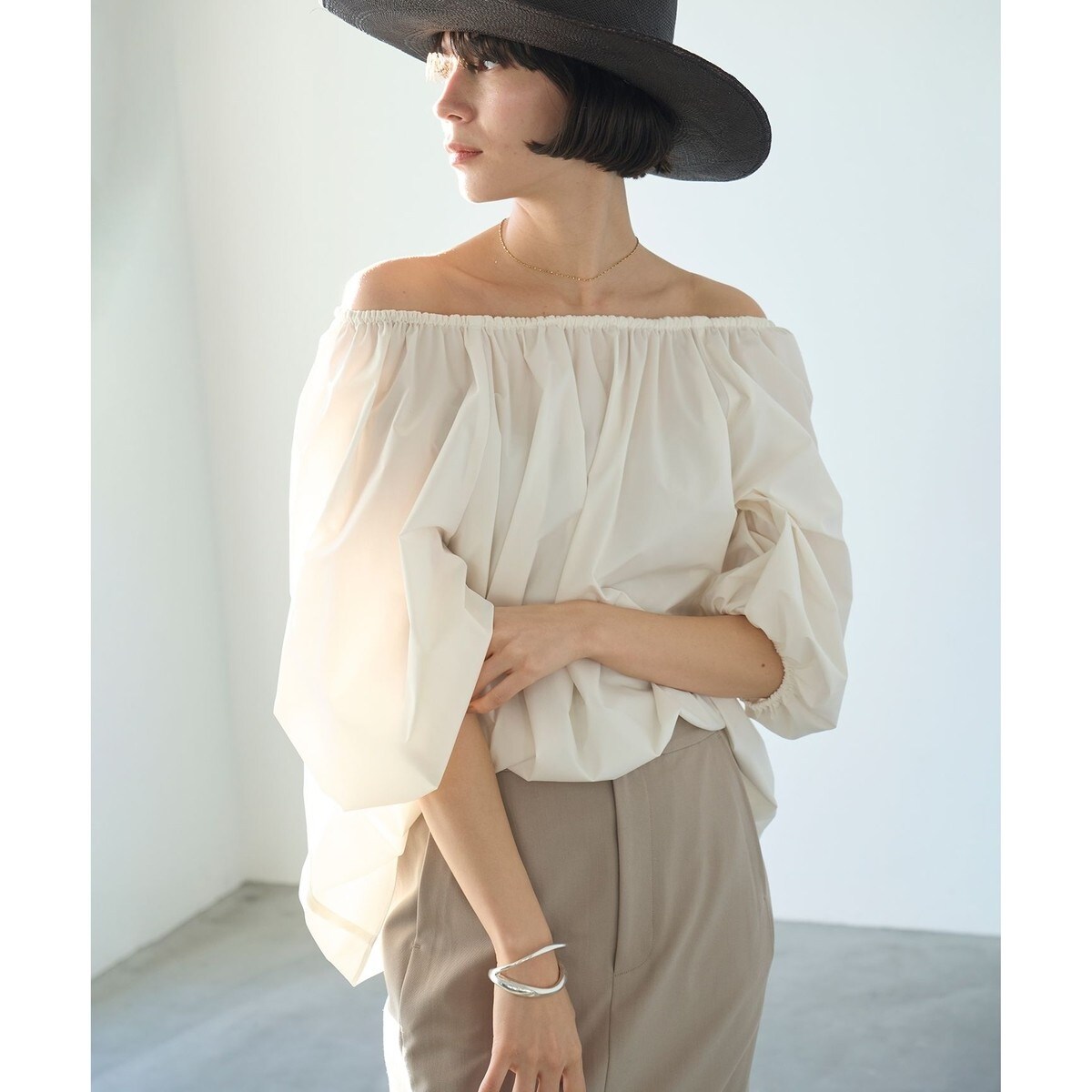 ■デザインギャザーブラウスとトレンドのオフショルダーを2WAYで楽しめるデザインブラウスです。広めのラウンドネックでフェミニンなギャザーブラウスとして着用できるだけではなく、襟ぐりにゴムが入っているので、オフショルダーとしての着こなしも可能です。首元のフィット感は後ろのリボンで調節可能です。デニムなどカジュアルなボトムを合わせると抜け感のある着こなしに仕上がります。ギャザーが作り出す立体的なシルエットが、スタイリングするボトムスに合わせて様々な印象を作ってくれる1着です。