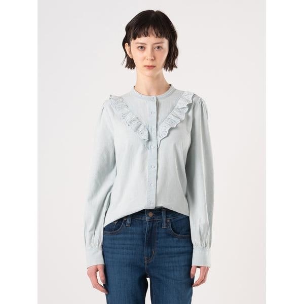ハイネックとクラシックなフロントボタンアップ、ブルゾンスリーブのあるデザインで、ロマンティックなアイレットディテールを施しました。レーヨン90%/麻10%の生地、爽やかなライトブルーカラーで春先から活躍間違いなしの一着です。