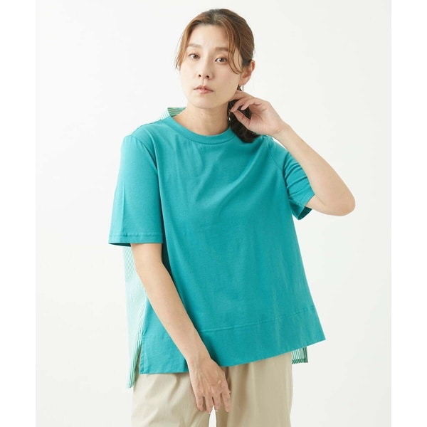 前身頃には無地のコットンジャージ生地を、後衿・後身頃にはストライプ柄のブラウス生地を使い併せたデザイントップスです。Tシャツとブラウスの良いとこ取りをしたアイテムで、カジュアルにもきれい目にも使えるアイテムです。サイドから見たデザインも、正面と背面の異なる生地感が目を惹いて、唯一無二なおしゃれさが感じられます。どこから見られてもGOODなカットソーです。