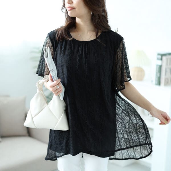 縦ラインを強調した総レースで着痩せも叶うフェミニンなチュニックの登場です。美しいフレアーのAラインは気になるお腹周りも綺麗にカバーしれます。後ろが少し長いデザインでサイドからのシルエットもスッキリして見えます。袖は透け感があり抜け感をプラス。女性らしいデザインで幅広い年齢の方におすすめです。
