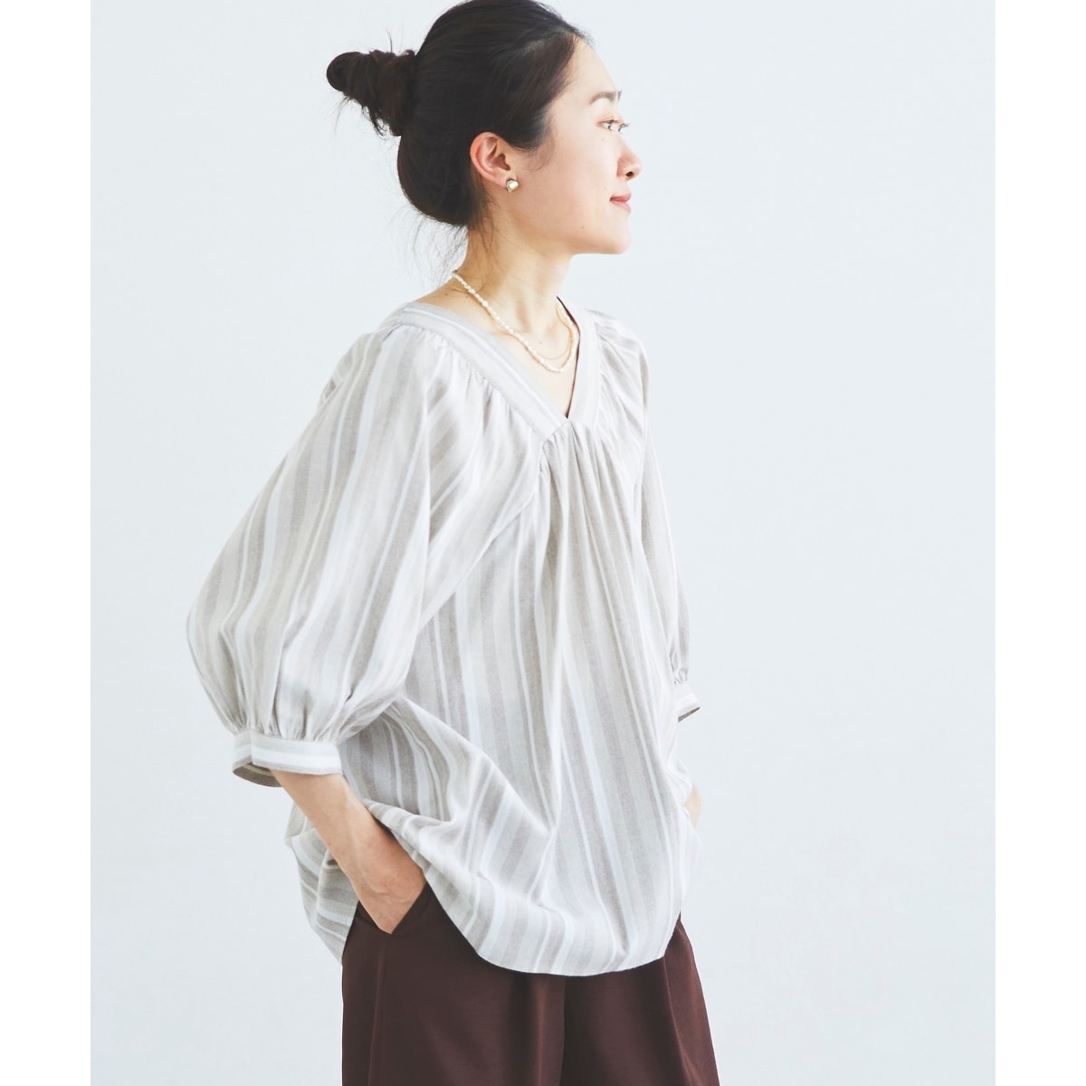 ボリュームスリーブで気になる腕回りをしっかりカバーし、Vネックですっきり抜け感のある女性らしいデザインが◎