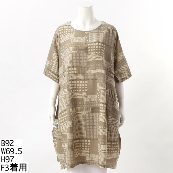 個性的なエスニック調幾何学模様のおしゃれなプリントの2段切り替えのコクーンチュニックです。ポケット付きで便利です。