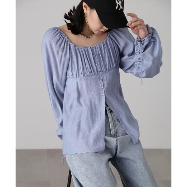 表面感のある楊柳ライクなさらっとした素材を使った軽やかな印象のブラウスです。ギャザーで柔らかい雰囲気に仕上げたスクエアネックラインと、袖のドロストギャザーボリュームがポイント。フロント裾のスリットで抜け感をプラスしています。肩まわりはゴム入りなので、オフショルダーとしても着ていただけます。※モデルの着用画像の場合、光の当たり具合により、実際の色味と異なって見えることがございます。色味は、商品単体の画像をご参照ください。