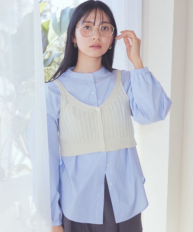 透かし編みがキュートなニットビスチェ×シャツのセットトップス。合わせて着るだけで旬テイストなレイヤードスタイルが完成します。ストライプ柄が爽やかなブラックとアイボリー、シンプルな白シャツを合わせたベージュの3色展開。それぞれ単品でも着回しの出来る便利なアンサンブルです。