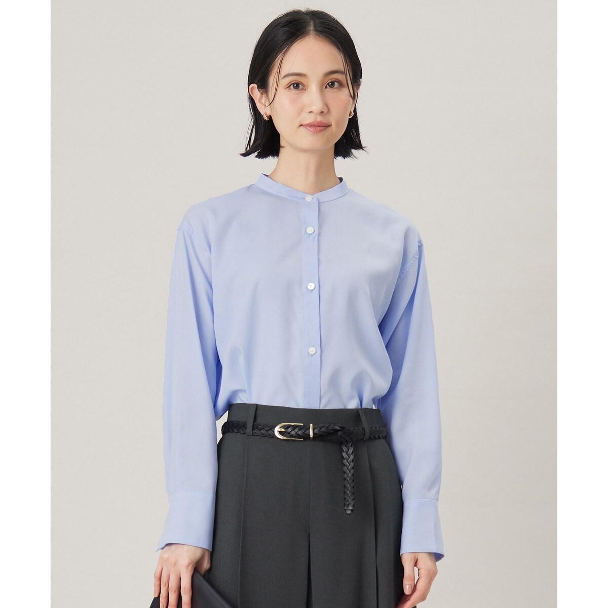 しなやかな落ち感のある女性らしい素材のバンドカラーブラウス■デザインシンプルなバンドカラーのブラウスです。肩幅と身頃に程よくゆとりを持たせ、しなやかな素材の落ち感と相まって大人っぽい抜け感を感じられるシルエットに仕上げました。1枚ではもちろん、コンパクトなバンドカラーでニットのインナーとしてレイヤードしてもバランス良く着て頂けます。無地2色とストライプ2色の展開で、ラメブルーストライプ(173)カラーは、ストライプの白地に繊細なシルバーのラメを施しております。※画像はサンプルを使用しております。実際にお届けする商品は、ラメブルーストライプ(173)カラーのボタンホールが表地と同じブルーになります。■素材ポルトガルのSOMELOS社で織り上げた、セルロース系再生繊維のブラウス素材です。ストライプは自由区別注柄です。丁寧に織り上げられ、しなやかさ、ドレープ感、程よいハリ感の全てがバランス良く計算しつくされた仕上がりとなっております。ソフトな風合いで肌触りが柔らかく、シルクのような光沢感、清涼感があるため着心地の良い素材です。■同素材アイテムチュニックブラウス(BLW7GM0312)クロップド丈ブラウス(BLW7GM0313)