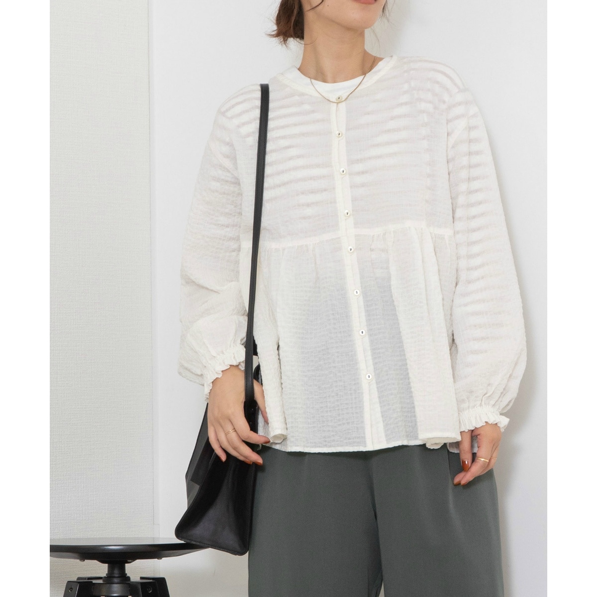 新品 OPAQUE.CLIP バンドカラー ペプラムシャツ レディース L 青 オペークドットクリップ ストライプ ブラウス 長袖 トップス カットソー