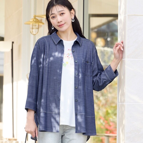 カジュアルコーデに欠かせないデニム調のシャツは、きれいな面感で大人が着やすい印象に。