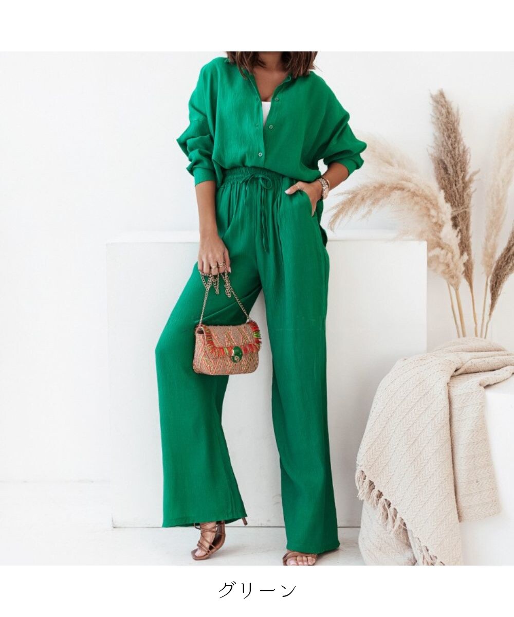 ルーズなサイズ感が今っぽいシャツセットアップが登場。<br>フロントボタンを少し閉めてズボンにインしたり、ボタンを全部開けて羽織るように着たり、それぞれ単体で着たりと様々な着方を楽しめるアイテムです。<br>ズボンはウエストゴム仕様なのでゆったり着られて嬉しい◎<br>さっと組み合わせるだけでオシャレに決まる、コーデに悩んだ時にも便利なアイテムです♪<br>■注意事項<br>・お使いのモニターや端末により、質感・色合いが実際の商品と異なって見える場合がございます。<br>・表記サイズは測り方によって1?2cmの誤差が生じる場合がございます。ご了承くださいませ。