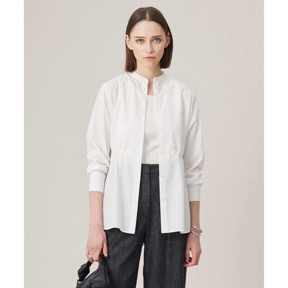 ■デザインウエストのドローストリングがポイントのバンドカラーシャツです。ヒップが隠れるレングスで、細身のパンツとも気にせず着用していただけます。一枚でもレイヤードでも、フロント釦を外して羽織りとしても、着回しの利くアイテムに仕上げました。