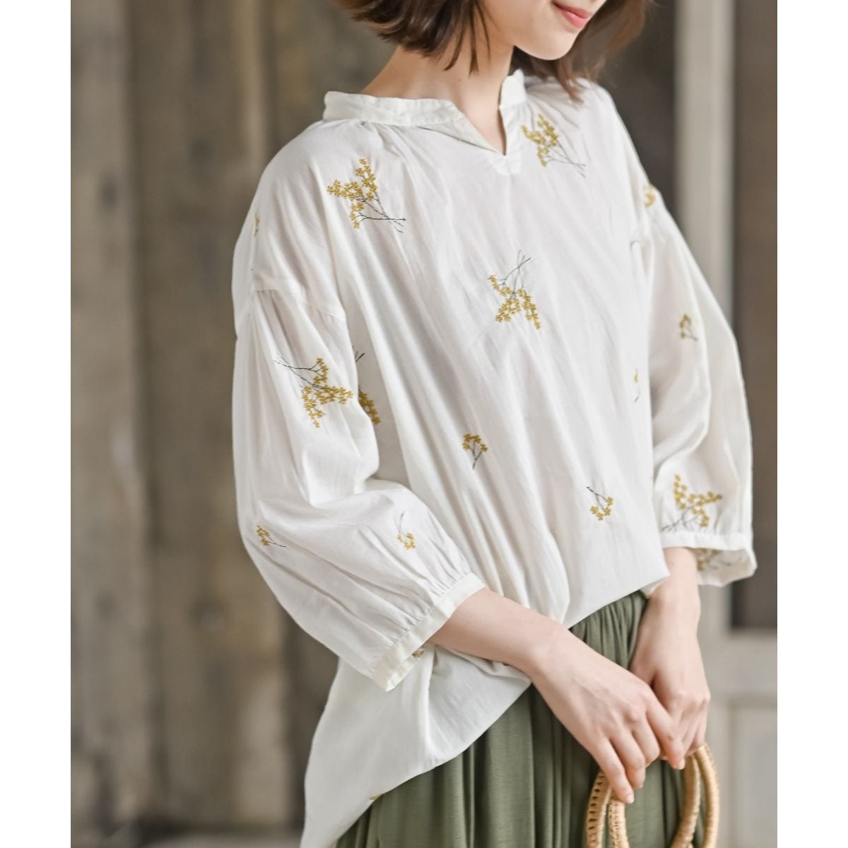 花刺繍入り7分袖ブラウス
