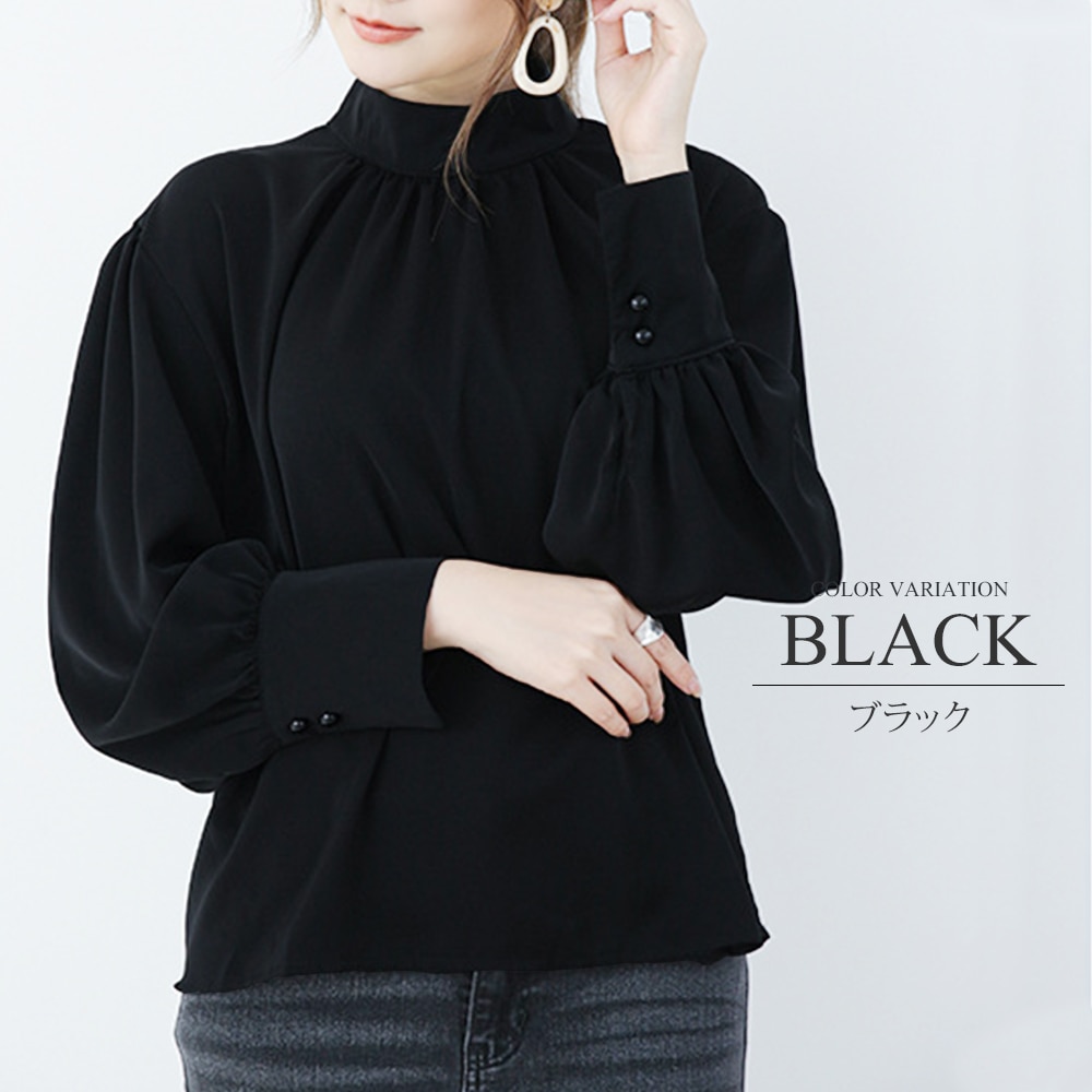 ローリーズファーム バックボタン ドット ギャザー 切り替え シフォン 異素材 半袖 ブラウス トップス ブラック 黒 M