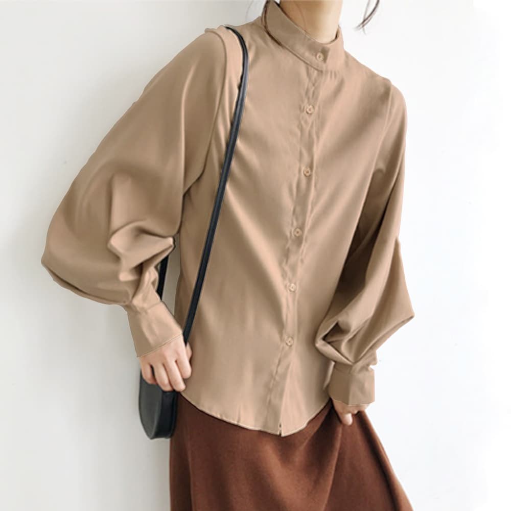 シャツ ブラウス レディース バルーンスリーブ ブラウス 長袖シャツ スタンドカラーシャツ トップス ボリューム袖