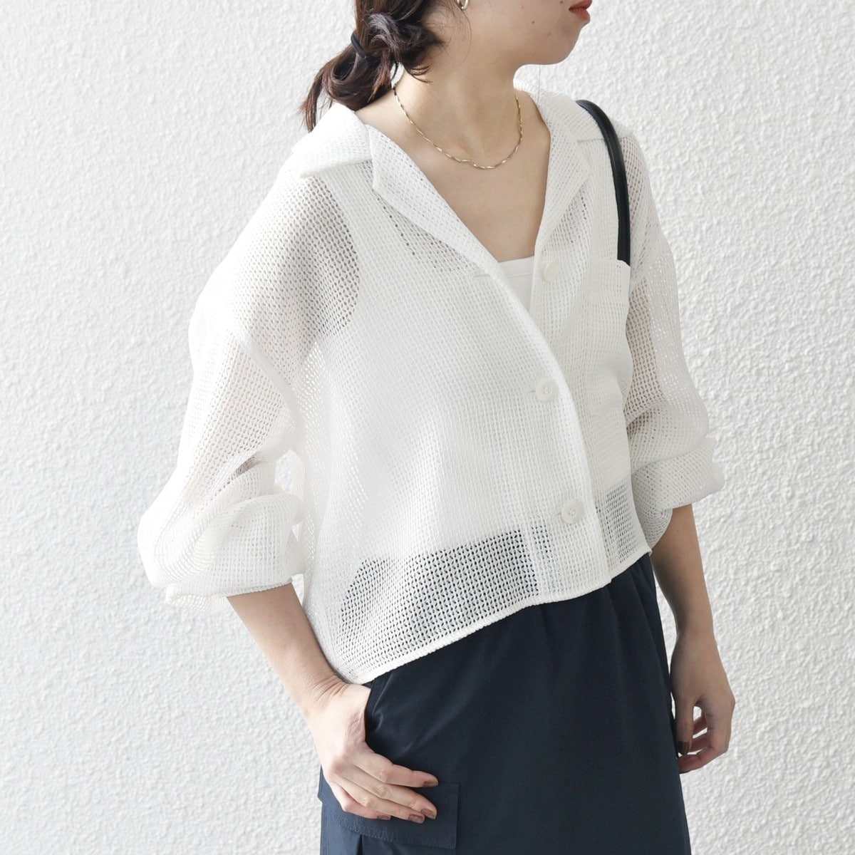 トレンド感のあるメッシュ素材を使用したショート丈の開襟シャツ。