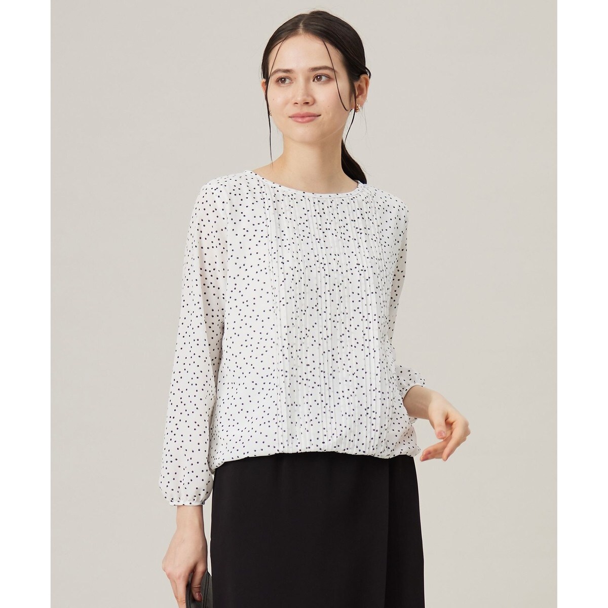 通勤や華やかシーンに活躍する上品なドット柄シフォンブラウス■デザイン上品なプリーツがエレガントなムードを演出する柔らかなタッチの変形ドット柄プリントブラウスです。シアーな素材ですが、身頃は透け防止の裏地付きで優しい肌触りです。袖はシアー感を残して1枚仕立てにしており、裾はボリュームを抑えたバルーン型のデザインです。通勤やセレモニーシーンにはもちろん、カーディガンを羽織ってデニムと合わせたキレイめカジュアルスタイルもおすすめです。■素材表地は繊細で軽やかな手触りと表面感のある上品なシフォン素材です。裏地は毛羽立ちを押さえながら、ソフトな手触りに仕上がっています。■同素材アイテム無地ブラウス(KKWMCA0334)