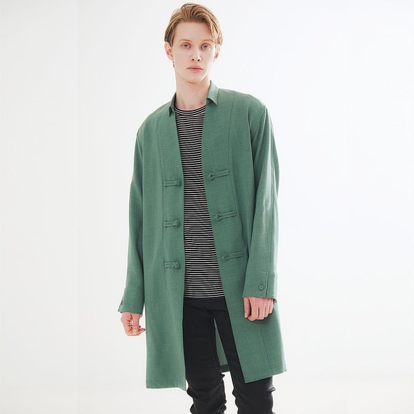 フロントのチャイナボタンがアクセントとなったロングシャツ。カンフーシャツから着想を得たデザインで、スタンドカラーのような小振りな襟は台襟を低く設定しスタンド気味にデザイン。フロントボタンもブランドオリジナルといった拘りの一着。春先にはライトアウターとしても活躍します。