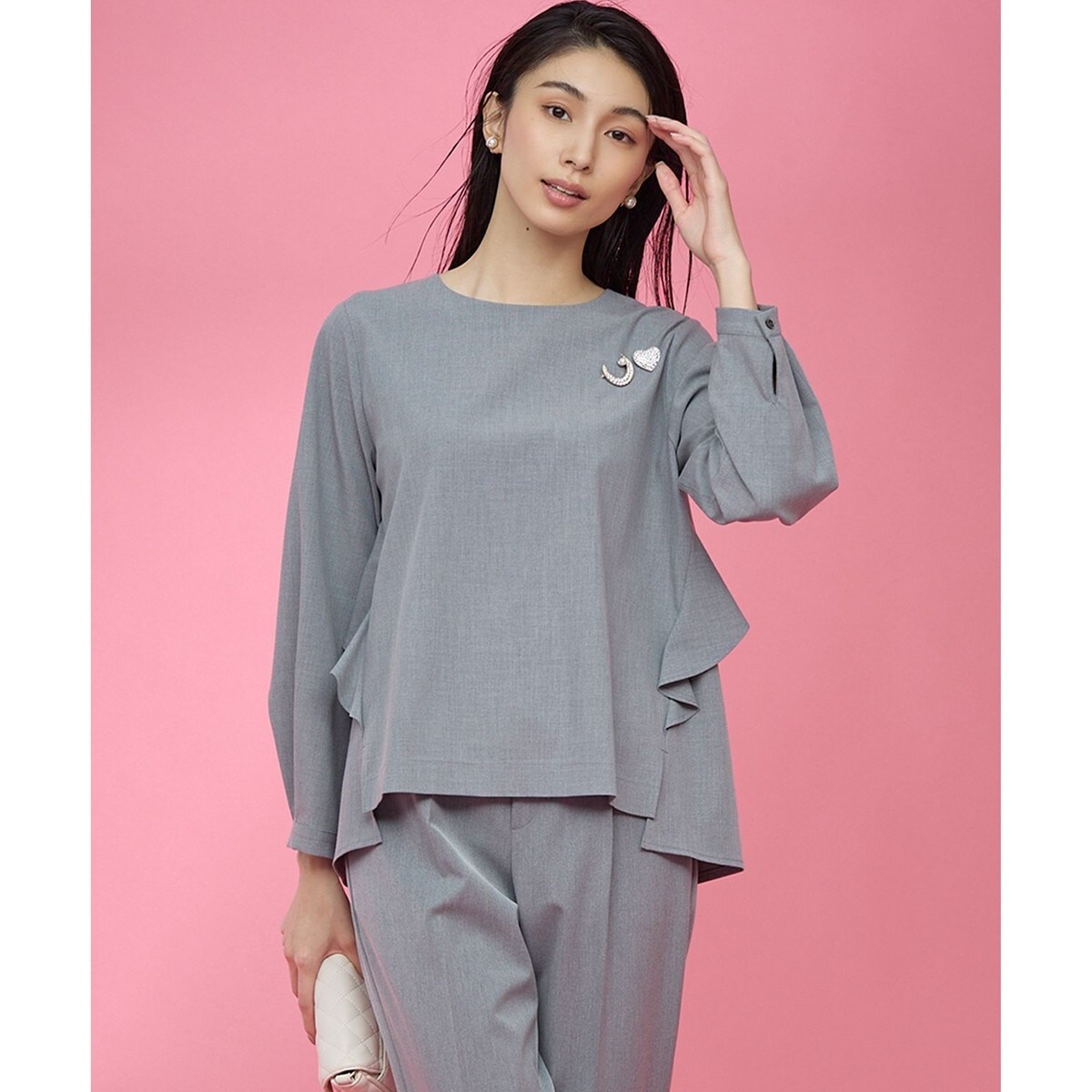 バックヨークから前身頃のシームに繋がった、立体的なフリルデザインが華やかな9分袖ブラウス。前後差があり、ヒップを包み込むようなほどよいコクーンシルエットで、アウトでも決まりの良いレングスに仕上げました。梳毛素材を使用することで、甘口なディテールも大人な表情に。同素材のパンツとのセットアップ着用で、よりフォーマル感が高まり、結婚式や式典などのフォーマルな装いにも最適です。冬はタートルニットを重ねたスタイルも素敵です。