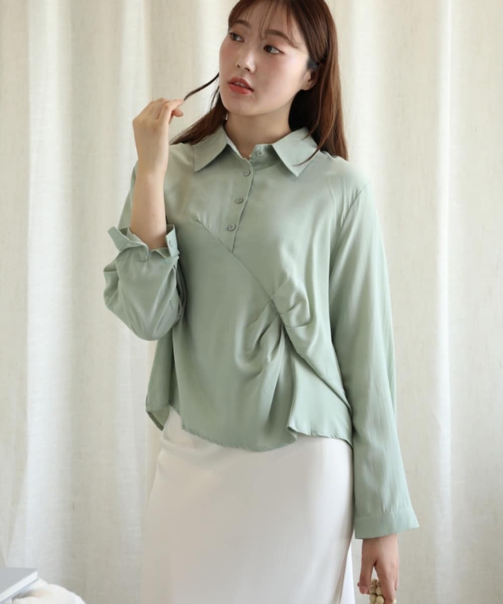 長袖シャツ/--/--/WHT/無地/ギャザー