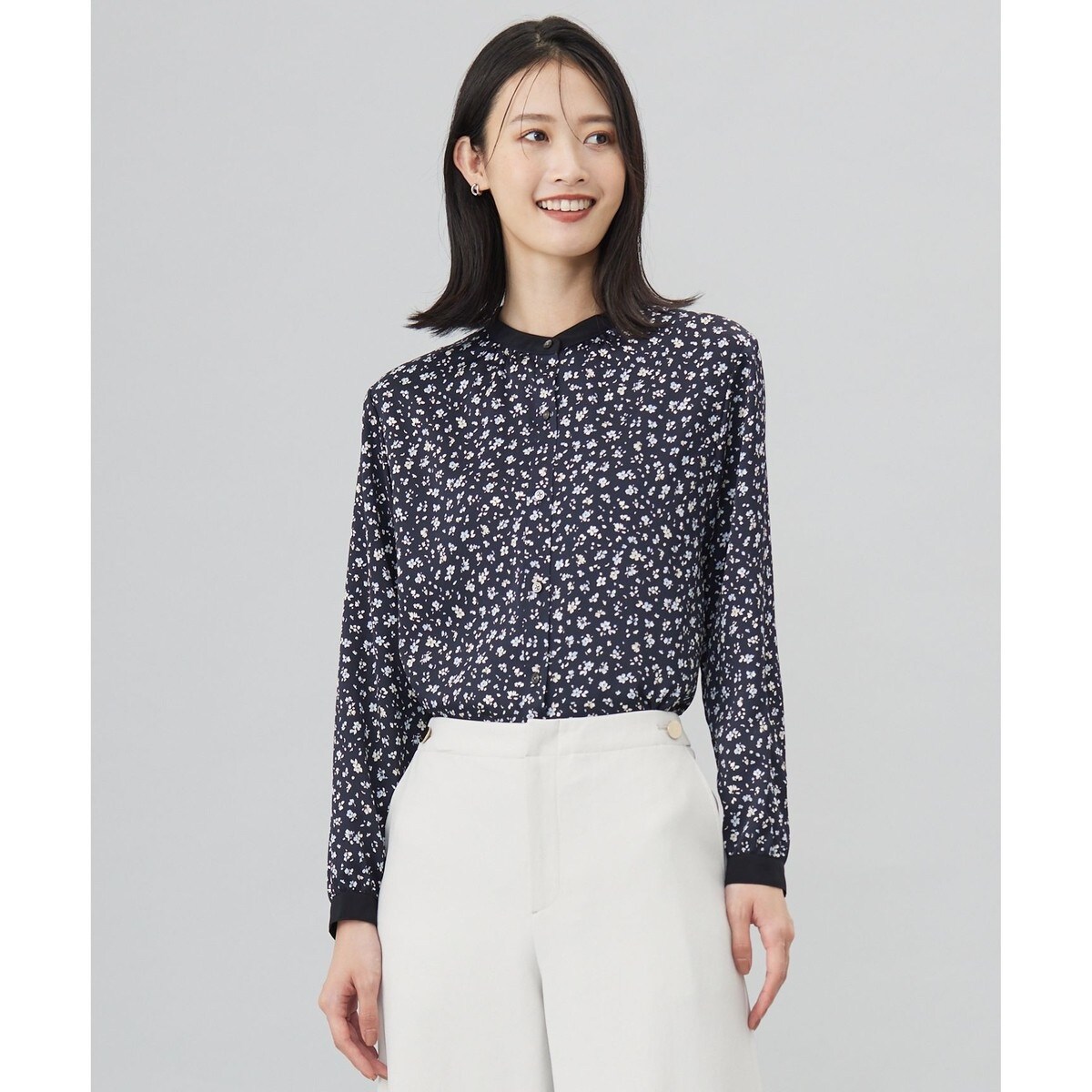 繊細な花柄でぱっと華やぐ、ボトムスを選ばないバンドカラーブラウス