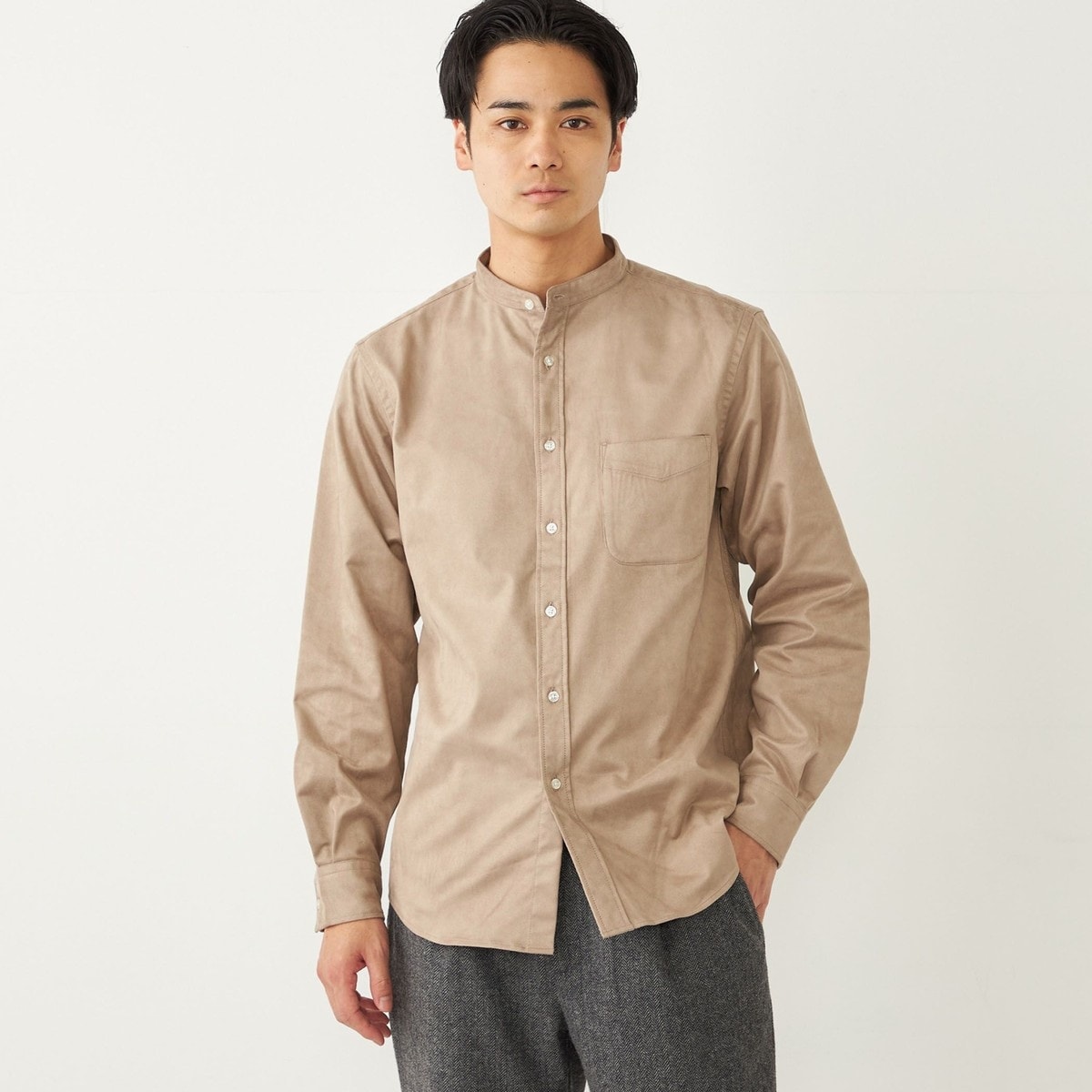 ポリエステルフェイクスエードのバンドカラーシャツ。