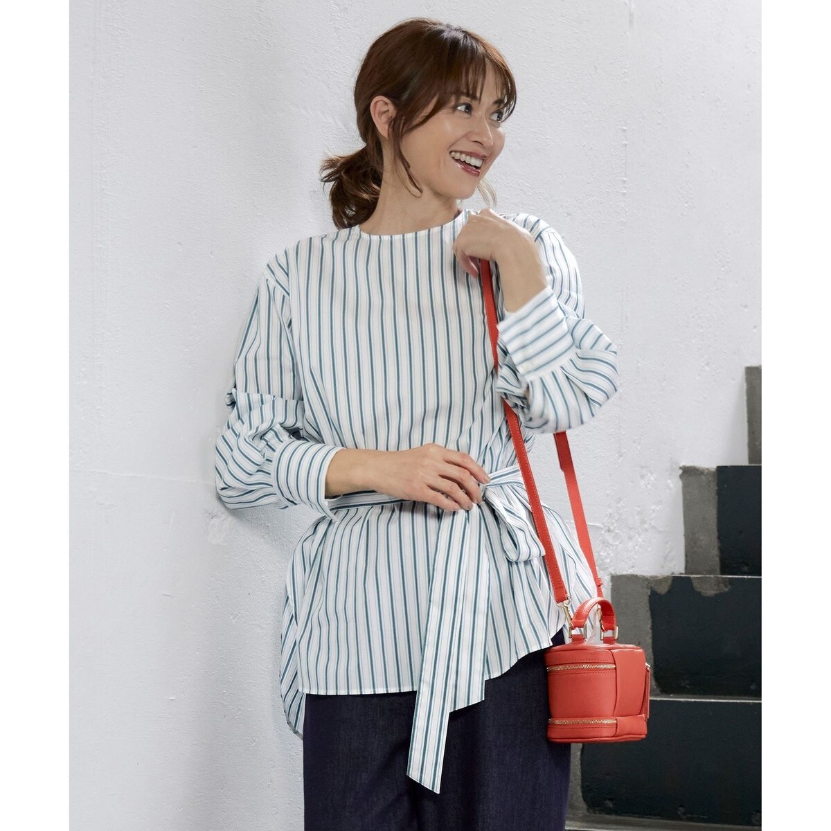付属のベルトでシルエットの変化を楽しめるチュニックブラウス■デザインクルーネックのチュニック丈ブラウスです。腰周りが隠れるチュニック丈で、裾をテールのデザインにすることで女性らしく軽やかに着て頂けます。パンツやストレートシルエットスカートと合わせやすく、付属のベルトでウエストをマークしたスタイリングも楽しんでいただけます。ストライプ柄2色、無地2色の計4色展開です。