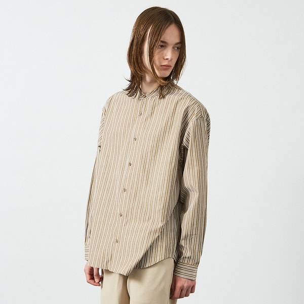 バンドカラーで首回りはすっきりとした印象で厚みのあるボタンがアクセントに。