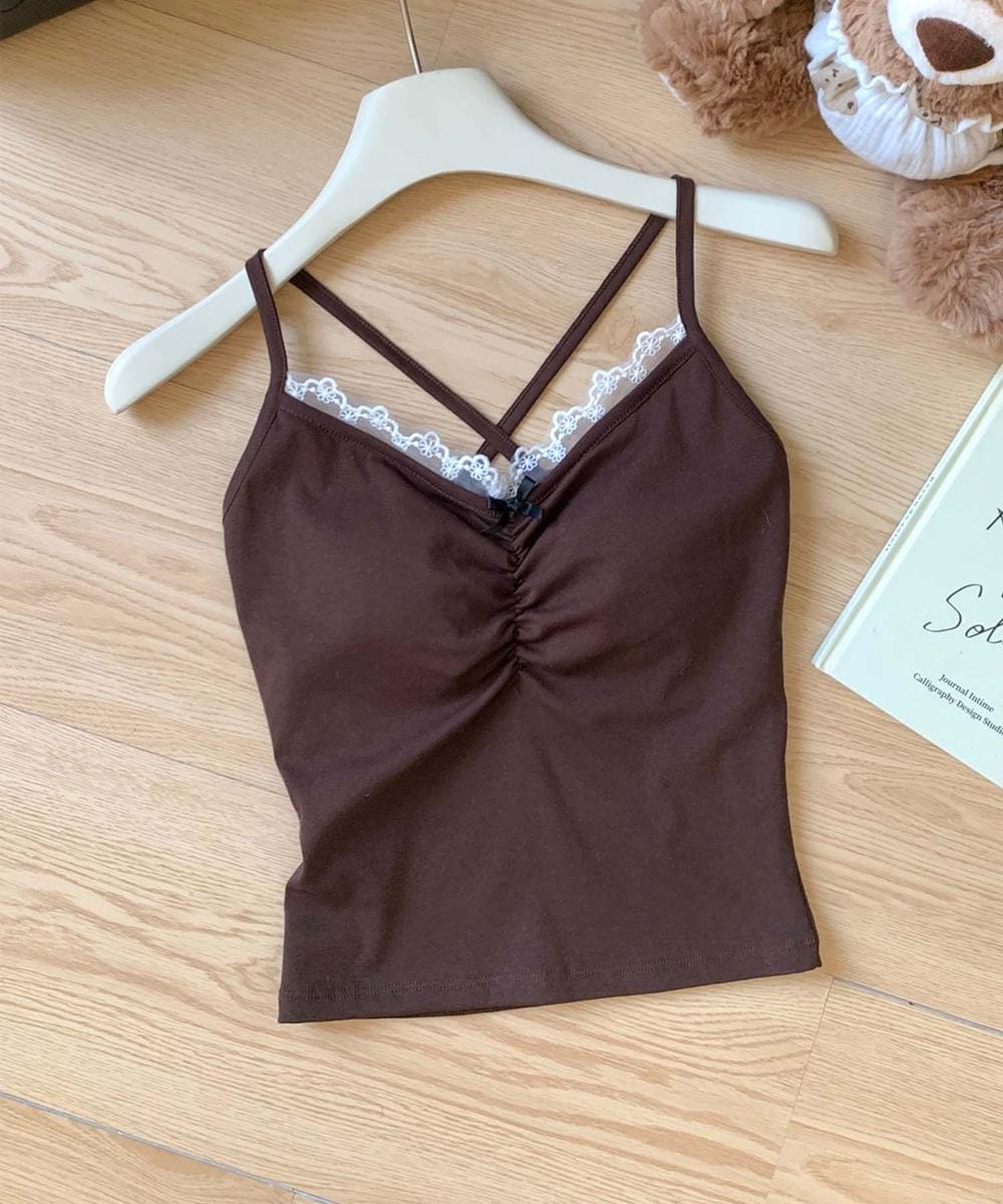 背中のクロスデザインと胸元の可愛らしいリボンが特徴。繊細なレースのトリムがエレガントさを引き立てフェミニンに。シンプルなデザインでありながら、どこか贅沢な印象を与えてくれる一枚です。
