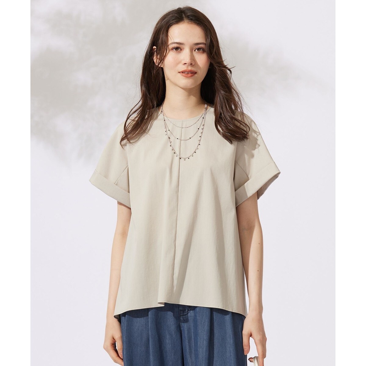 バックフレアが華やかな大人のTブラウス■デザインシンプルなTブラウスです。後ろ身頃に多めに入れたフレアと前後差のある裾ラインが、気になる腰周りはカバーしつつも、程よい華やかさを演出します。Tシャツのような気軽さで活躍する、大人っぽい抜け感を感じられるデザインです。同素材のパンツ(PRW7CM0602)と合わせてオールインワン風のコーディネートがおすすめです。■素材薄手でさらっとしたドライタッチと、適度なハリ感、ストレッチ性が特徴です。仕上げにタンブラー加工を施した肌触りの良い質感が清涼感があり、接触冷感、UVケアと暑い時期に適した素材です。シワになりにくいのもポイントです。■同素材アイテムワンピース(OPW7CM0602)テーパードパンツ(PRW7CM0602)
