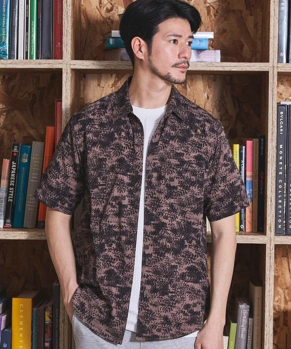 フラワー柄プリントレギュラーカラー半袖シャツ