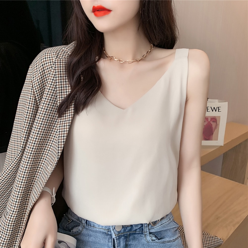 Vネックで女性らしいシルエット、涼しげで透け感のあるエレガントなシフォンキャミソール