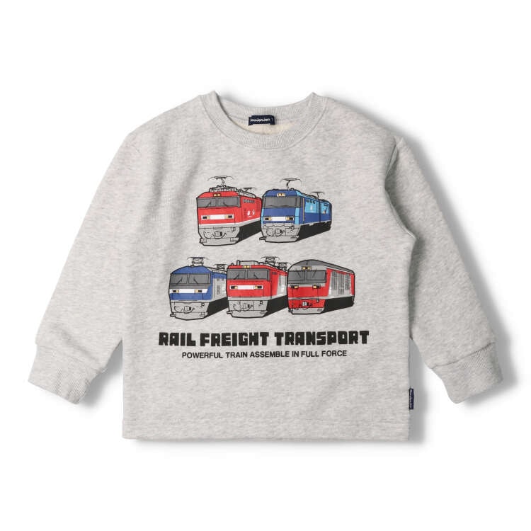 男の子が大好きな電車アイテム!人気のJR貨物電車、貨物列車デザイン!色々な貨物電車がプリントされたトレーナー、スウェット。後ろ身頃裾にはコンテナのアップリケ付き。裏毛素材で秋から春まで長く着られます。【アイテム】長袖 ロングスリーブ トップス カジュアル お洒落 オシャレ かっこいい かわいい 可愛い 普段着 デイリーウェア お出かけ着 お外遊び着 子ども こども 男児 男の子 ボーイズ キッズ ベビーサイズ トドラーサイズ 幼稚園 保育園 小学校 通園 通学 小学生 2023年秋冬物新作 丸高衣料 鉄道 子鉄 車両 電車 電鉄 トレイン グレー 灰色 コン ネイビー 紺色 ムージョンジョン コットン100% 綿100%