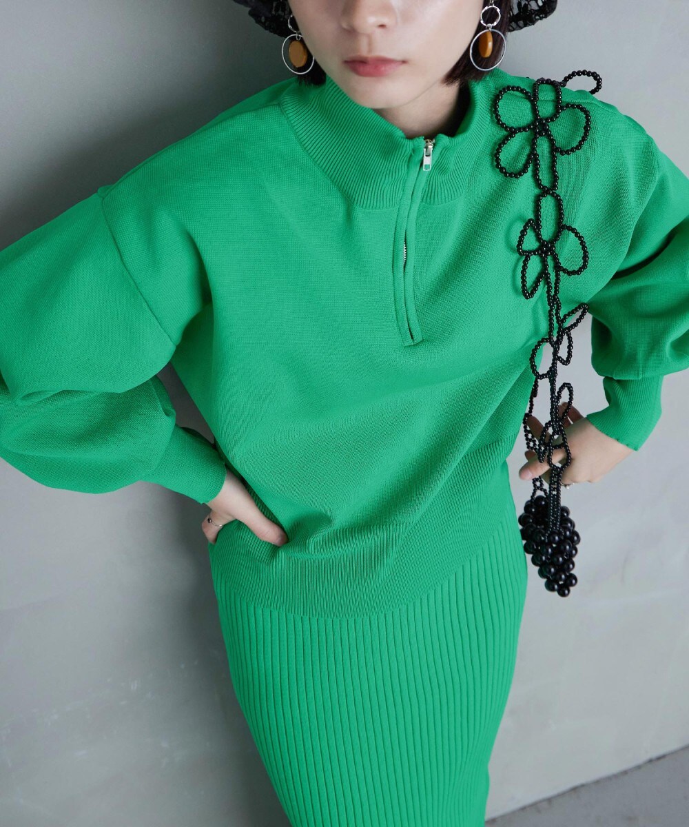 同素材のft0320005074(ニットロングスカート)とのセットアップでの着用も可能。