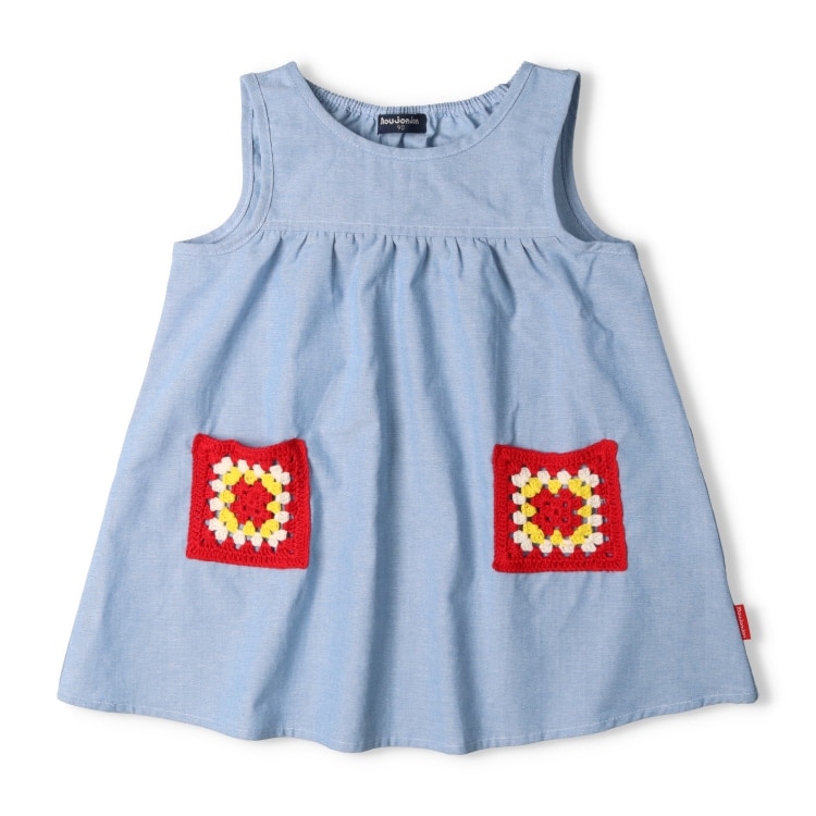 ポケットのかぎ針編みモチーフがポイント!ダンガリー素材のジャンパースカート、ジャンスカ。春や秋は長袖と、夏は半袖に合わせて、長く使えるアイテム。【アイテム】トップス シンプル ガーリー フェミニン カジュアル お洒落 オシャレ かわいい 可愛い 普段着 デイリーウェア お出かけ着 お外着 お外遊び着 子ども こども 女児 女の子 ガールズ キッズ ベビーサイズ トドラーサイズ 幼稚園 保育園 小学校 通園 通学 小学生 2025年春夏物新作 丸高衣料 ジャンバースカート ジャンパースカート ジャンスカ ブルー 青色 ムージョンジョン コットン100% 綿100%