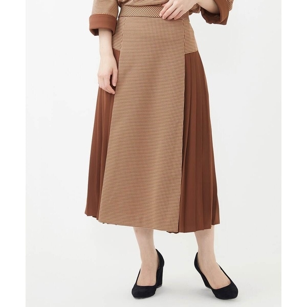 ジャージージャカードのチェック柄と無地のコンビネーションスカート。サイドの無地部分にはプリーツ加工を施し、動くたび軽やかに揺れて女性らしさを演出してくれる新鮮なデザイン。広がりすぎないシルエットですっきりとした印象へと導きます。コーディネート次第でクラシカルにも、モダンにも着こなせるスカートです。
