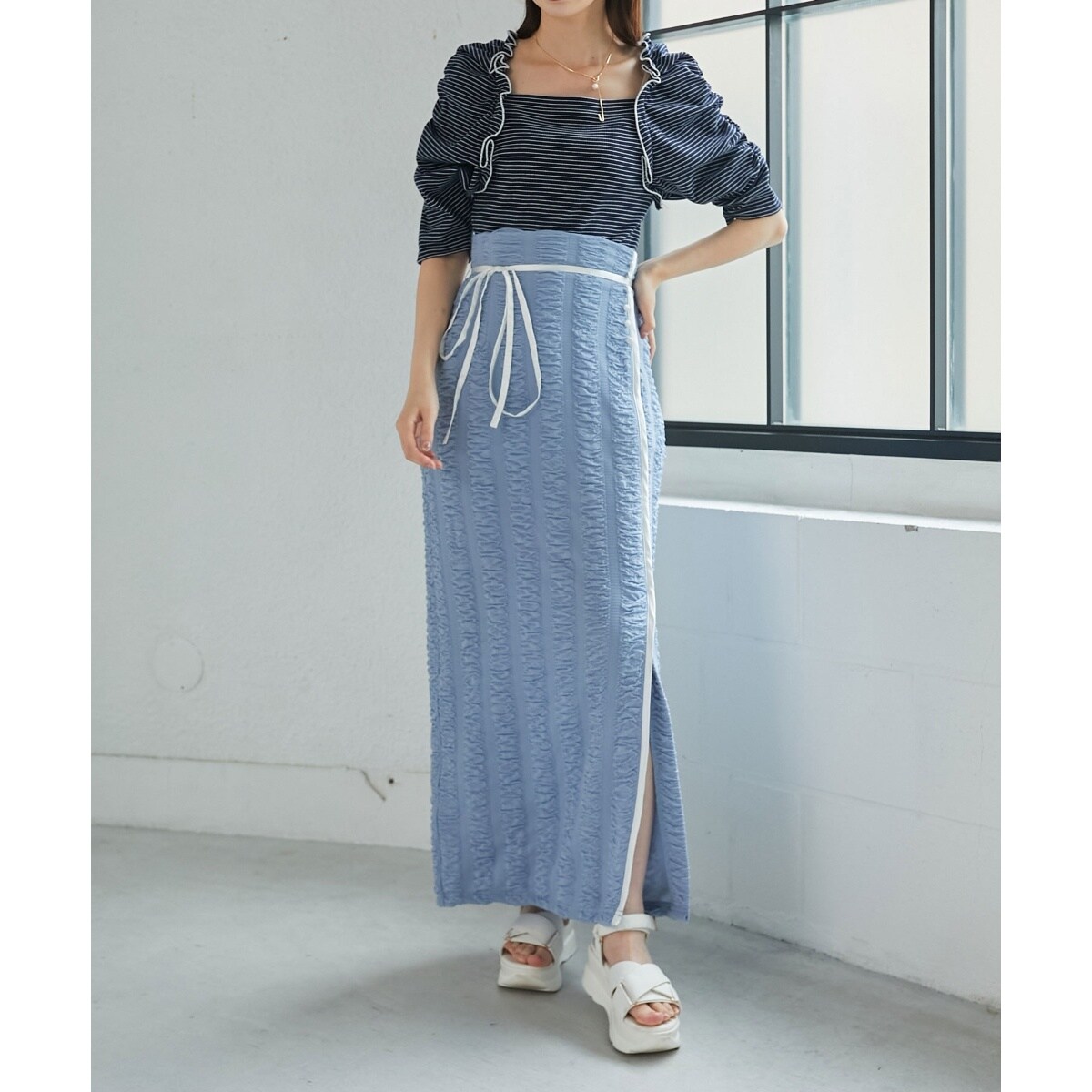 甘くなりすぎない表情のある生地を使用したナロースカート。