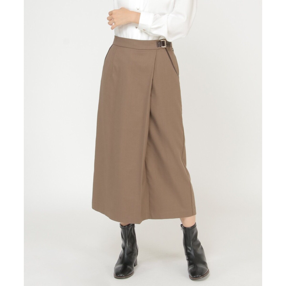 ウエストベルト、両ポケットラインにレザー調の合皮をあしらい、モード感をプラスしたアイテムです。