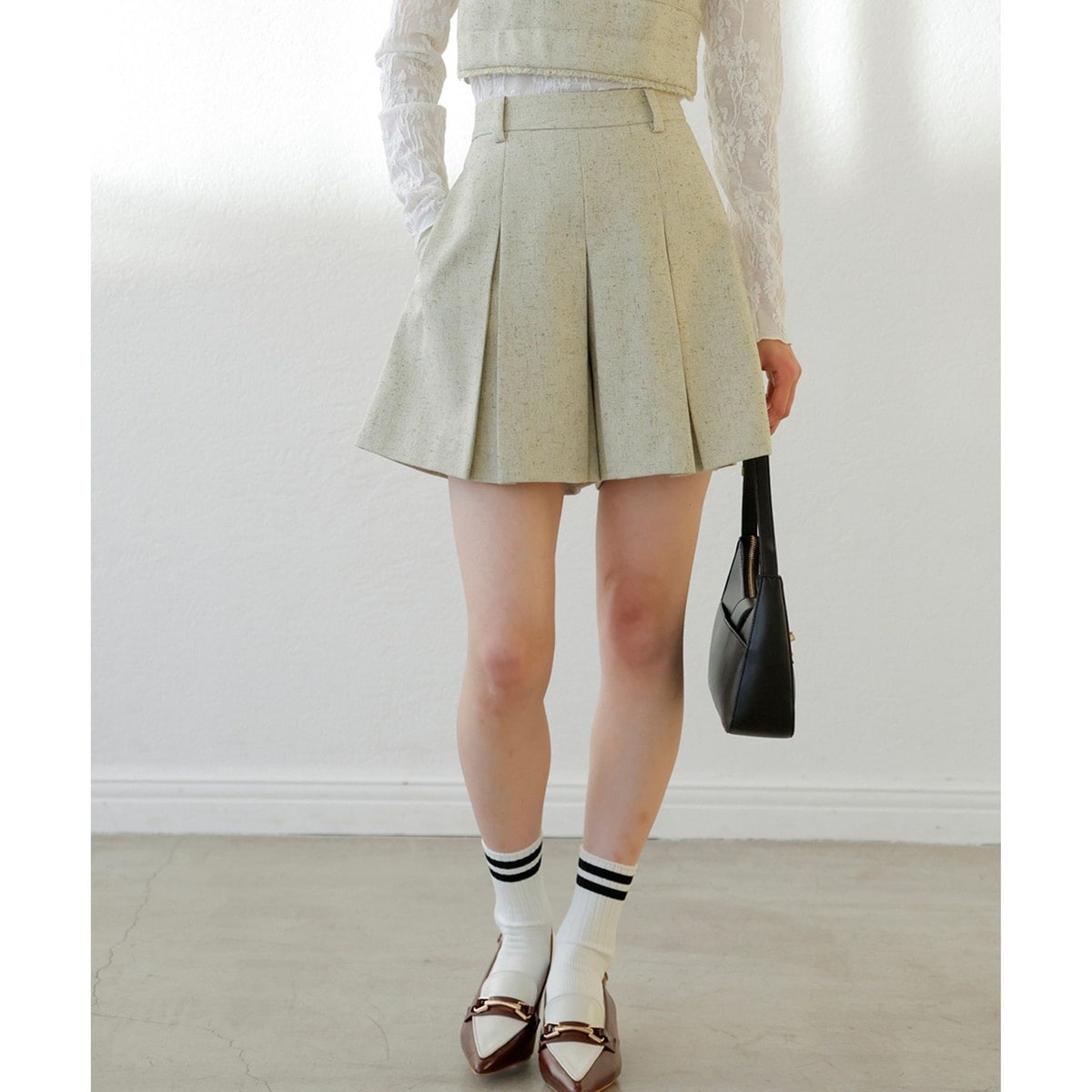 インパーテッドプリーツを贅沢に施したフレア感かわいいサマーツイードハーフパンツ。