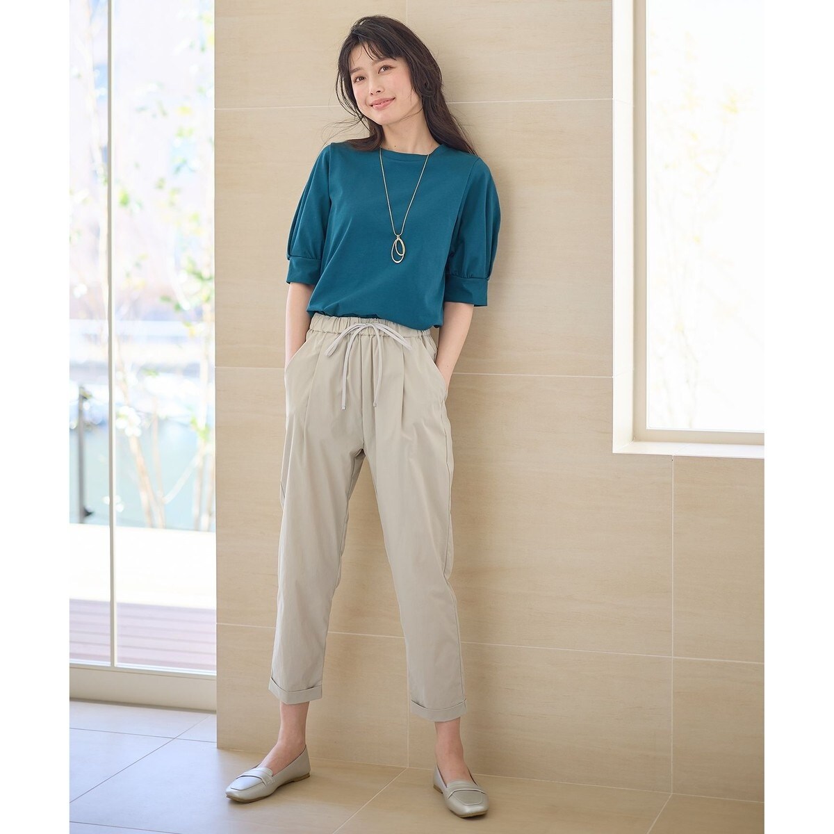 ・フラットシューズやヒールとあわせるとすっきりした印象に