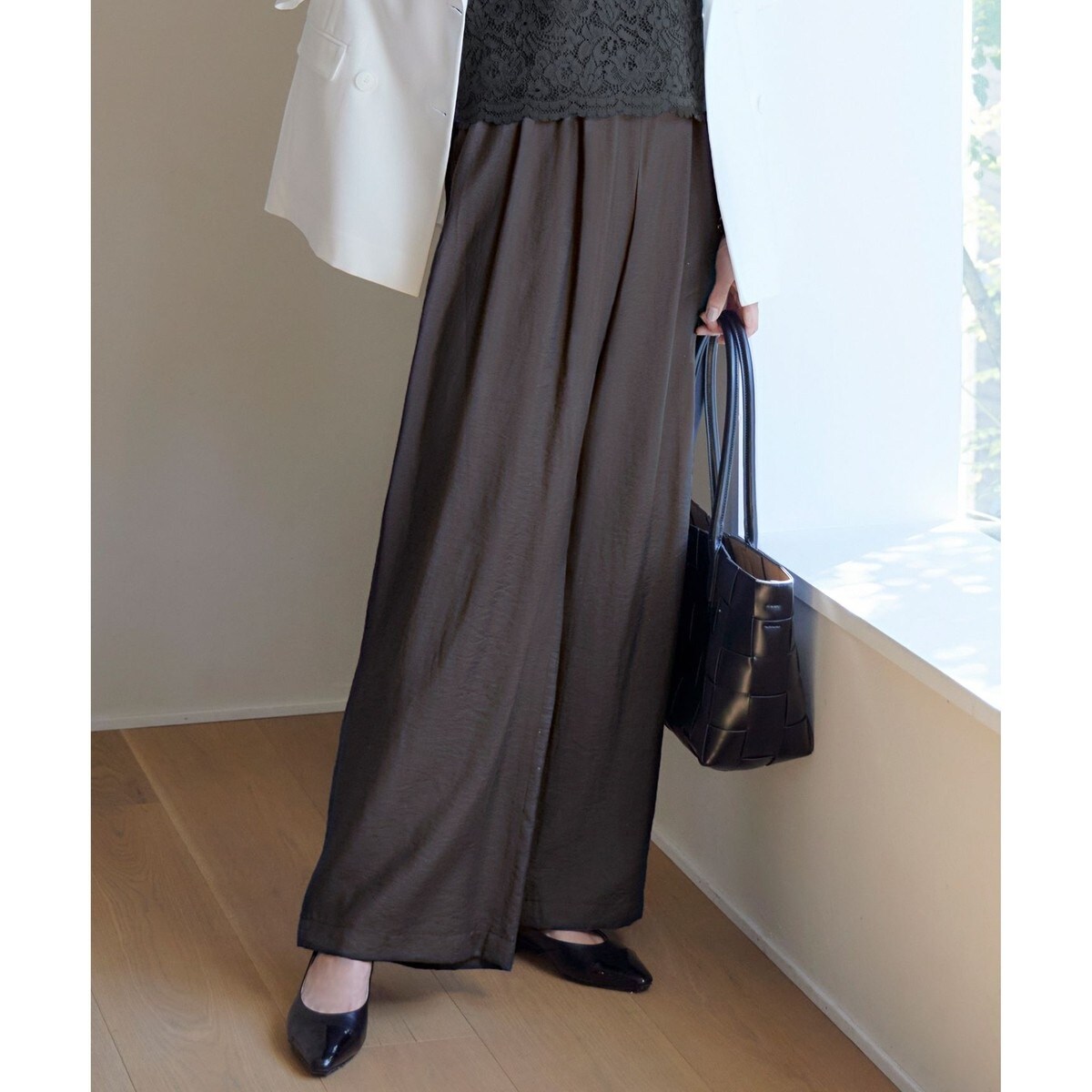人気のため新色追加!ドレープ感が女性らしい、快適な着心地のワイドパンツ■デザイン昨年大好評を頂いたウエスト総ゴムのワイドパンツです。イージーな着用感のゴムパンツでありながら、ウエスト位置が高く見えるようにデザインしています。しなやかで落ち感のある薄地の素材ですが、たっぷりと取ったタックとギャザーを入れることでしっかりとゆとりを生み、体のラインを拾いにくく、すっきりと見えるバランスに仕上げました。昨年の着心地の良さはそのままに、より腰周りがすっきりと見えるようにブラッシュアップしています。同素材のと合わせてオールインワン風のコーディネートもおすすめです。■素材柔らかく綺麗なレーヨンと程よい光沢感のあるナイロンを、とろみとドレープ感に若干のハリ感を出してバランスよく仕上げたツイル素材です。非常に軽く、揺れるような動きのある綺麗な素材ですが、やや表情のあるラフな表面感に仕上げた大人カジュアルな素材です。接触冷感、UVケアの機能付きです。■同素材アイテムプルオーバーブラウス(BLWMLM0517)ノースリーブブラウス(BLWMGM0507)キュロットパンツ(PRWMGM0508)