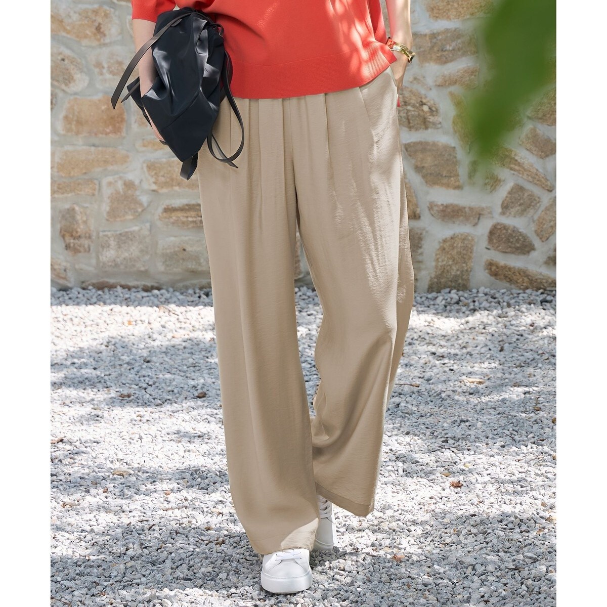 人気のため新色追加!ドレープ感が女性らしい、快適な着心地のワイドパンツ■デザイン昨年大好評を頂いたウエスト総ゴムのワイドパンツです。イージーな着用感のゴムパンツでありながら、ウエスト位置が高く見えるようにデザインしています。しなやかで落ち感のある薄地の素材ですが、たっぷりと取ったタックとギャザーを入れることでしっかりとゆとりを生み、体のラインを拾いにくく、すっきりと見えるバランスに仕上げました。昨年の着心地の良さはそのままに、より腰周りがすっきりと見えるようにブラッシュアップしています。同素材のと合わせてオールインワン風のコーディネートもおすすめです。■素材柔らかく綺麗なレーヨンと程よい光沢感のあるナイロンを、とろみとドレープ感に若干のハリ感を出してバランスよく仕上げたツイル素材です。非常に軽く、揺れるような動きのある綺麗な素材ですが、やや表情のあるラフな表面感に仕上げた大人カジュアルな素材です。接触冷感、UVケアの機能付きです。■同素材アイテムプルオーバーブラウス(BLWRLM0517)ノースリーブブラウス(BLWRGM0507)キュロットパンツ(PRWRGM0508)
