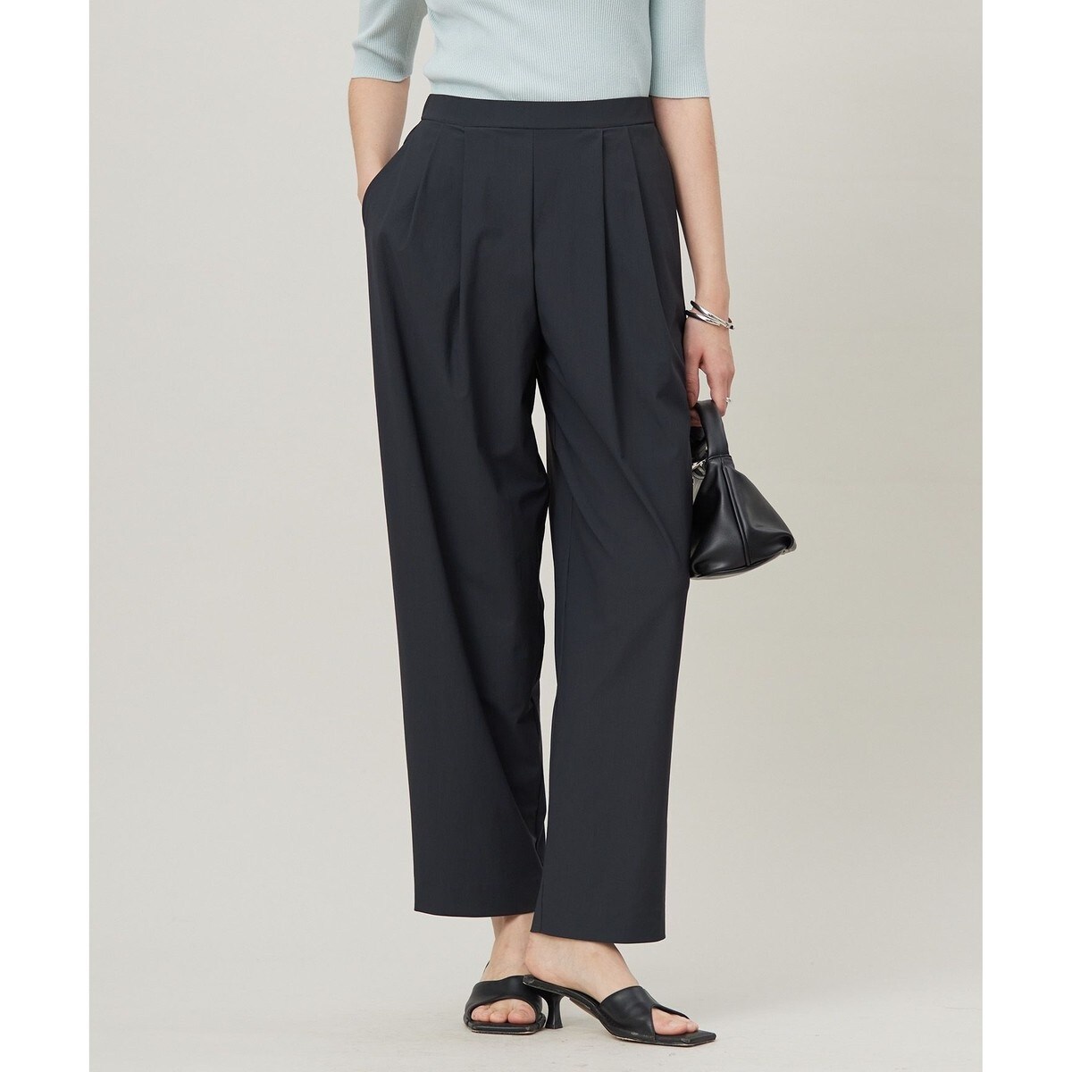■デザインダブルタックで腰回りにボリュームを持たせたテーパードパンツです。膝あたりから緩やかに絞ったラインが今までにない、新しいパンツシルエットに仕上げました。前ウエストはすっきりベルト、後ろはゆとりのあるギャザーウエストで、着脱のしやすさや着心地にもこだわった一本です。