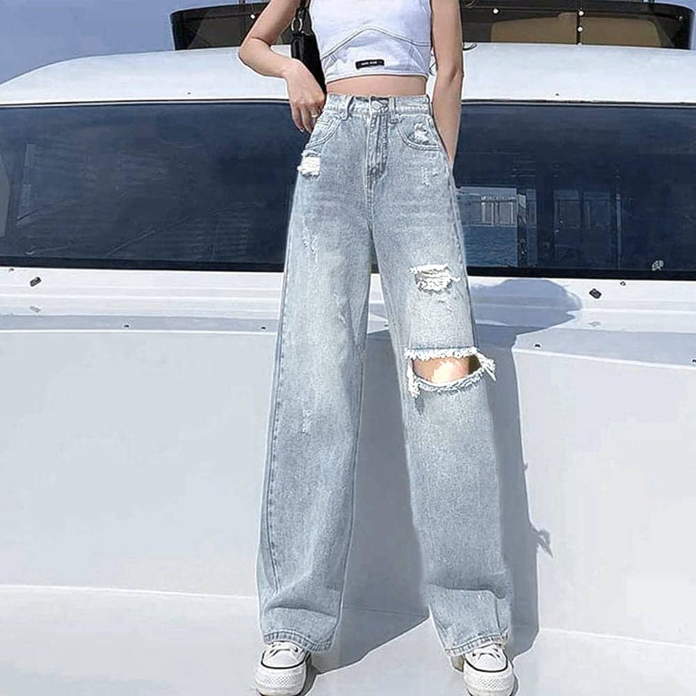 体型をカバーしながらも美脚を演出するデニムストレートパンツ