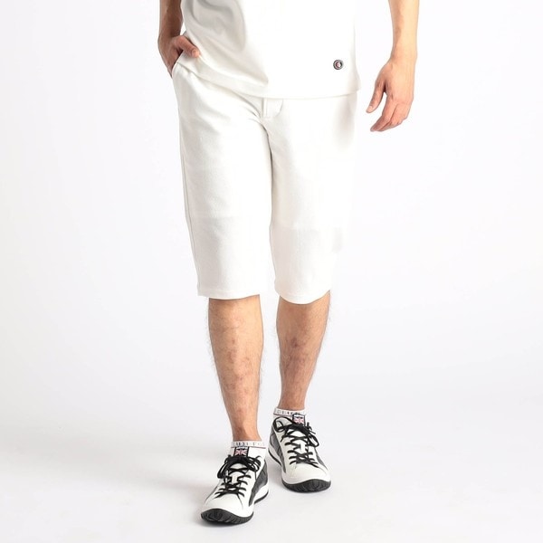 腰回りがすっきりした膝下丈で、テーパードシルエットが綺麗なハーフパンツになります。後ベルトがゴム仕様になっているのでフィット感があり、ドローコードで腰回りを絞ることができます。