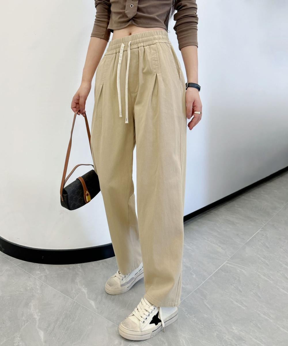 定番カジュアルパンツです。ウエスト部分はゴム仕様で、着脱が楽なのも嬉しいポイントです。ゆるっとしたサイズのニットとパンプスを合わせるとキレイめカジュアルな印象に。