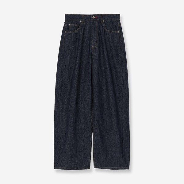 太ももにかけてややカーブさせたワイドフィットなシルエットで、裾にかけて徐々に細くなっています。