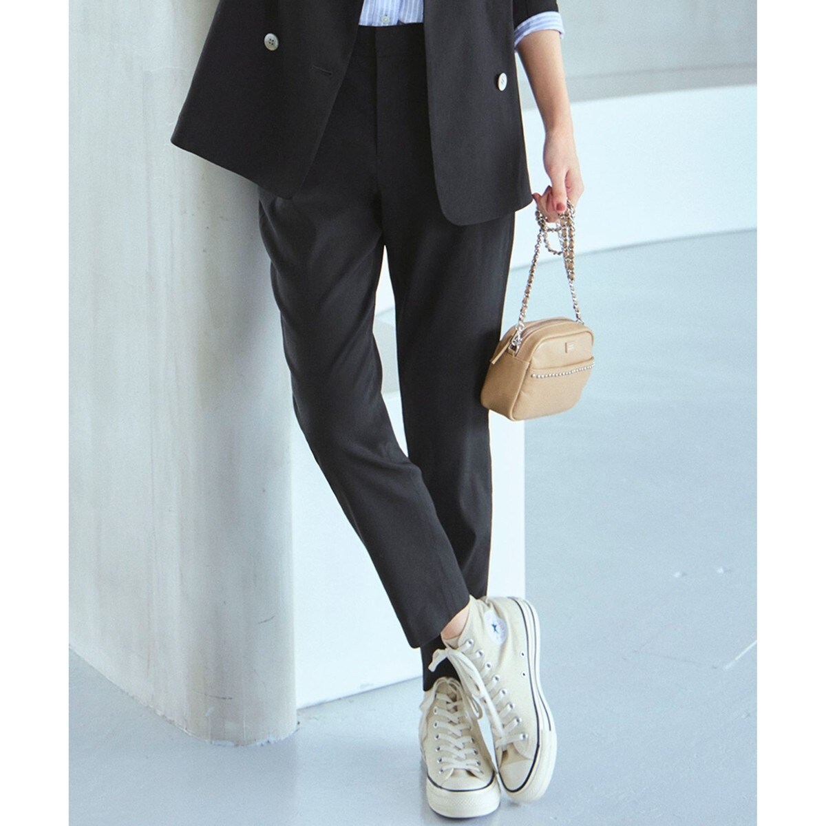 程よいゆとり感と後ろゴム仕様で穿き心地抜群のテーパードパンツ。前開き・ベルトループ付きのきちんとした仕様でフロントはスッキリと見えつつ、ウエストの後ろをゴムにすることで楽な着心地を実現。またヒールを履いてもパンツの裾が靴にかからない絶妙なレングスに仕上げています。リネン混でさらっとした着心地の素材感が春夏にぴったりです。どんなトップスにも合わせやすい万能パンツで、ベーシックカラーから着るだけで気分を上げてくれる華やかなカラーまでカラーバリエーションも豊富に取り揃えております。同素材のジャケットとのセットアップ対応も可能です。カラーはON/OFF使えるブラック(#005)、ネイビー(#075)、清涼感のあるホワイト(#001)、柔らかなベージュ(#033)、洒落感のあるダークブラウン(#035)のベーシックカラー5色に、オレンジ(#020)、イエロー(#040)、ダークグリーン(#065)のアクセントカラー3色を加えた、全8色展開です。