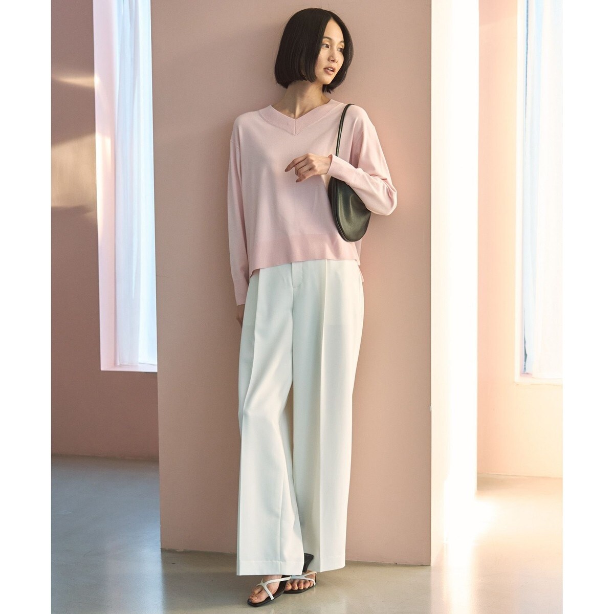 ■デザイン説明パンツと同素材の細ベルトがアクセントになったワイドストレートパンツ。センタープレスが縦のラインを強調し、ワイドシルエットでもすっきりとした印象を与えます。きちんと感を持ちながら、バックゴム仕様で履き心地も抜群。オン・オフ問わず、合わせるアイテム次第で様々なシーンに活躍する1枚です。