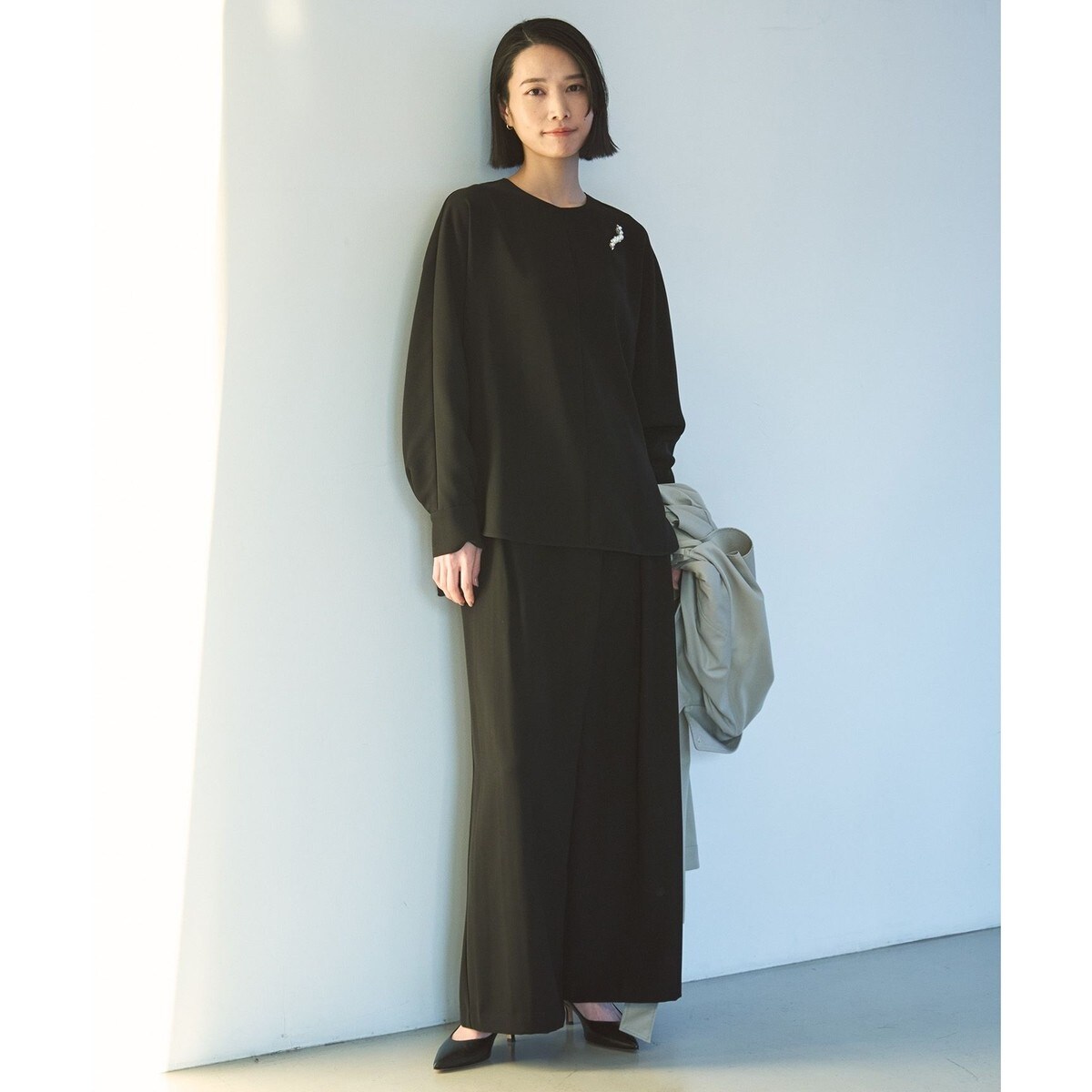 ■デザイン前見頃に重ねタックを施したアシンメトリーのラップパンツ。太すぎずリラックス感のあるワイドストレートシルエットで、下半身のラインを拾わずに着用いただけます。こなれ感のあるデザインは、オフィスからデイリーシーンまで幅広く活躍します。同素材のブラウスと合わせてセットアップでの着用もおすすめです。