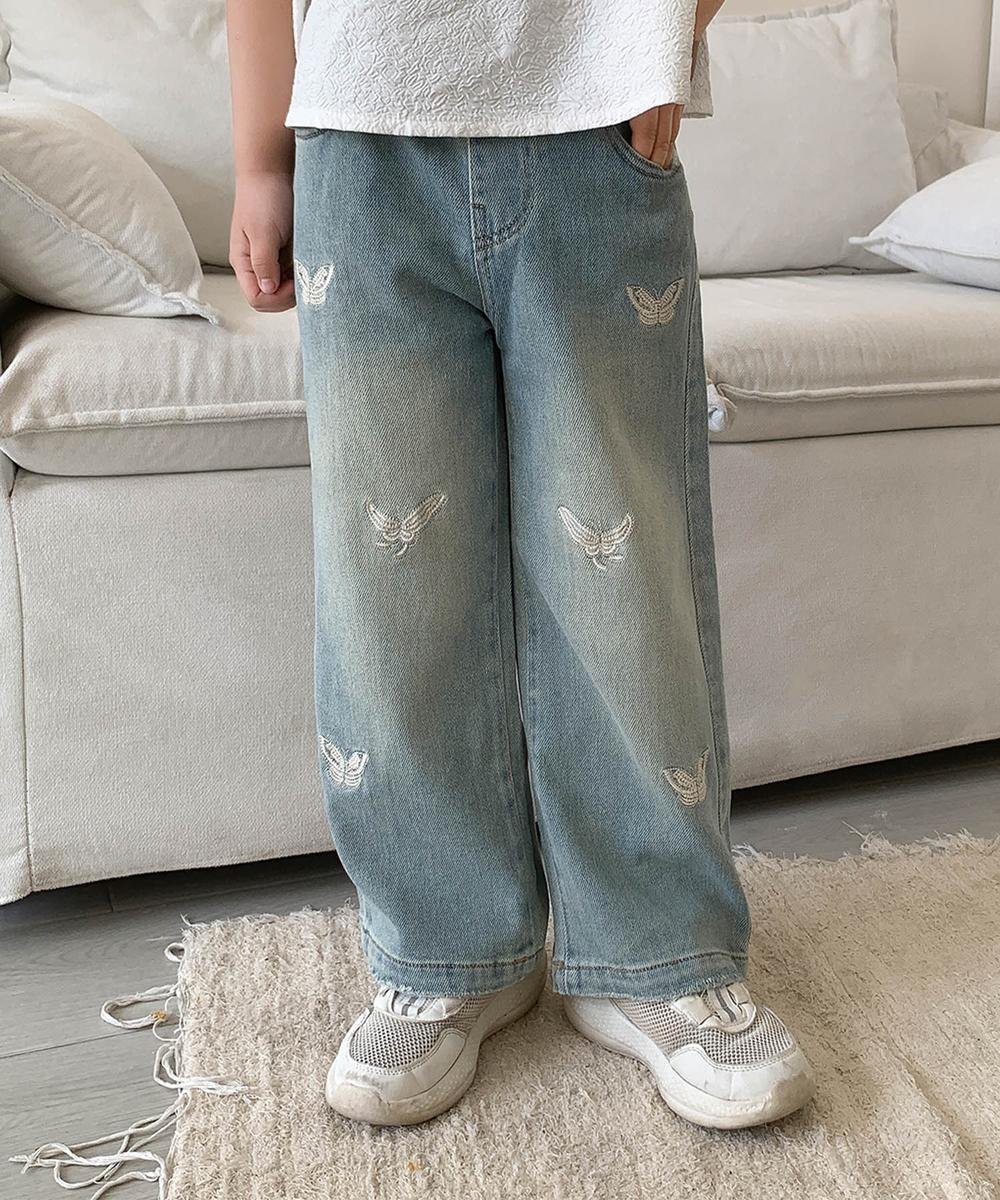 パンツ全体に施された蝶々の刺繍が可愛らしいダメージデニム風のキッズパンツ。優しい色落ち加減がナチュラルな雰囲気をプラスしています。ゆったりとしたストレートシルエットが動きやすさをサポートし、普段使いからお出かけまで活躍する一枚です。